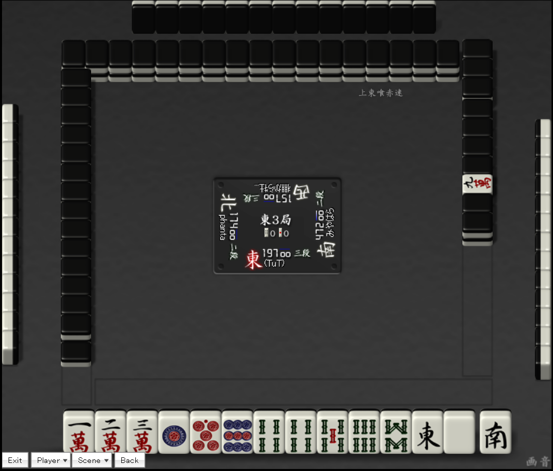 下家に東を打たれて親の役が中で濃厚になってきたら、上家からリーチとりあえず現物の6m切りから下家のリーチを受けて一発目。下家の現物は3pだけで、上家の現物はありません。ソウズの下が安全そうなので切っていきます。1sは上家の筋、下家は23sを切っているのでほぼ当たりません。親も123で鳴いたあとに3sを切っているので安全です。
