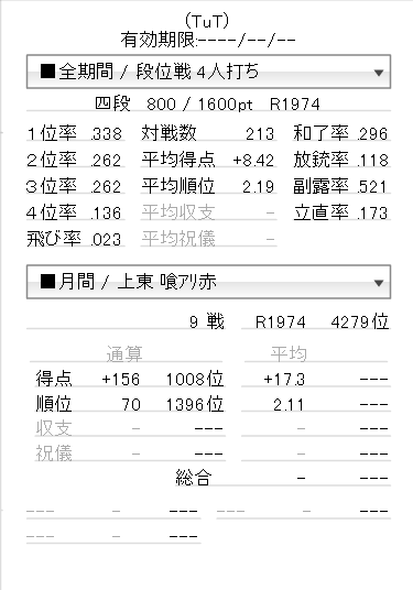 やりました!4段です!ちなみに東風戦だけです。フーロ率がいい感じですね。